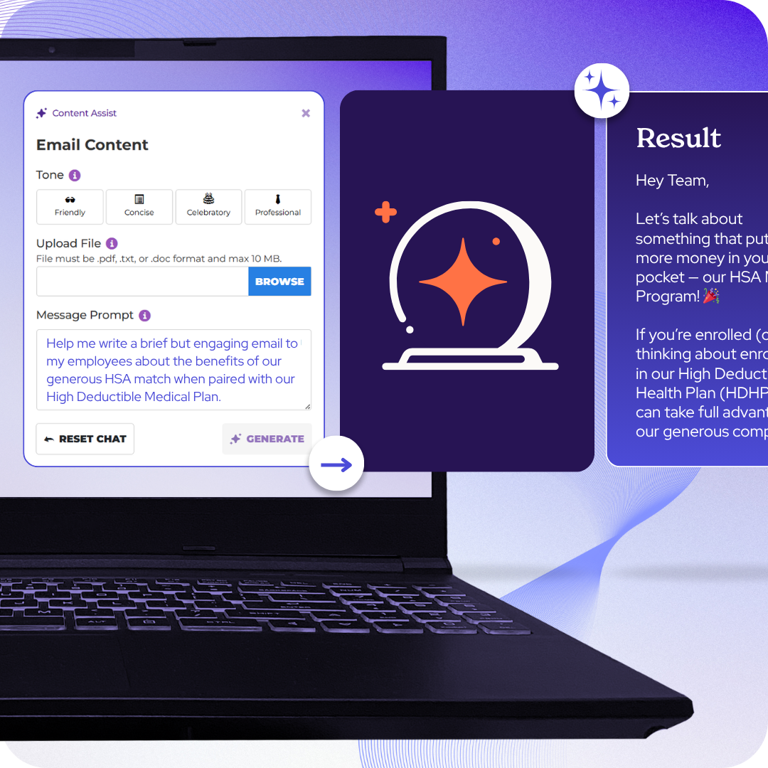 HR teams spend so much time crafting emails, reminders, and announcements — especially during open enrollment. Content Assist speeds that up, using AI to turn a plain-language prompt into accurate, engaging, employee-ready drafts in seconds.
